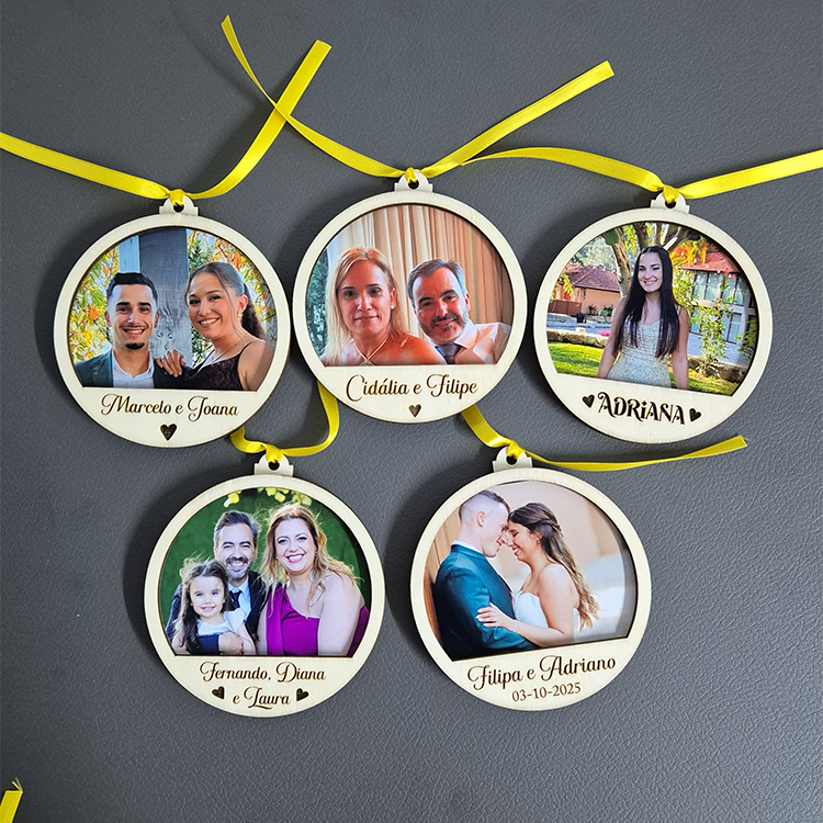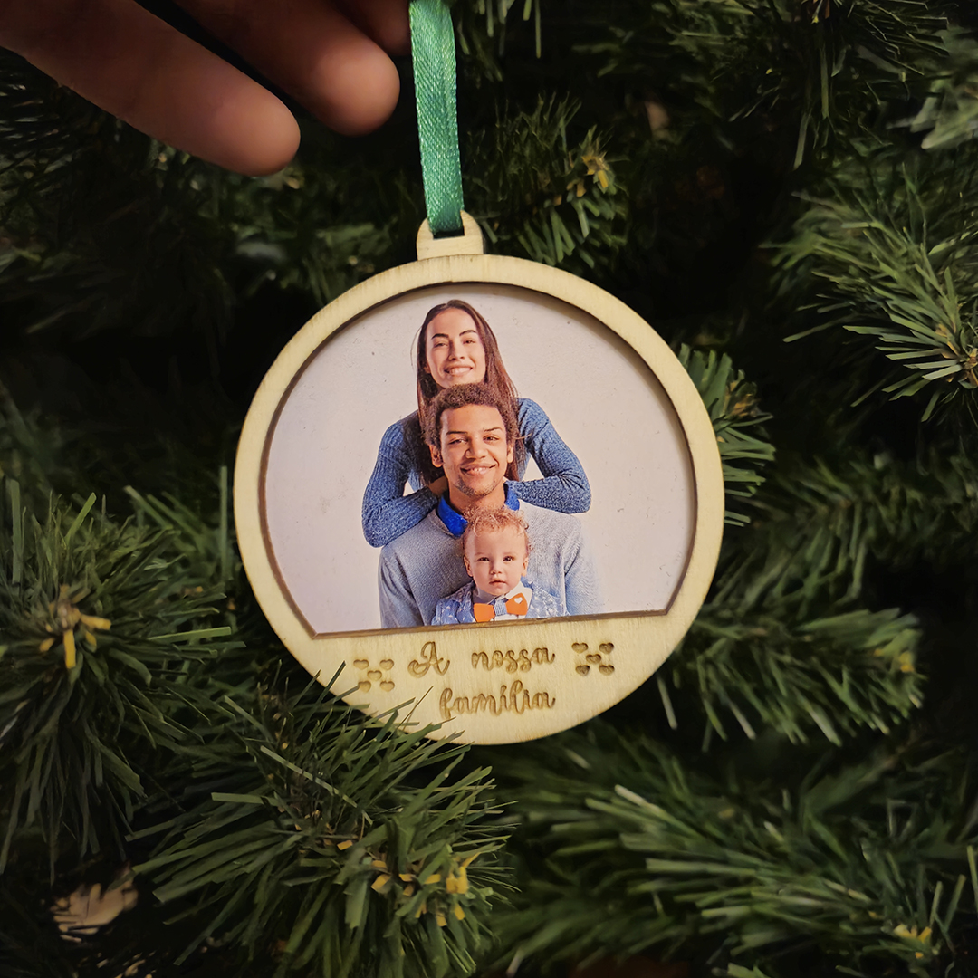 Bola de Natal em Madeira com Fotografia e Frase Personalizada