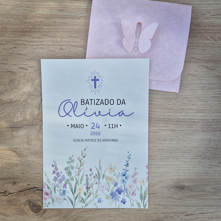 Delicado, elegante e cheio de simbolismo, este convite de batizado floral é a forma perfeita de anunciar um momento tão especial. Com um design suave e personalizado, torna-se numa lembrança bonita para convidar familiares e amigos a partilharem este dia único.