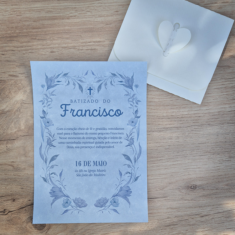 Elegante, delicado e cheio de simbolismo, este convite de batizado em tons de azul é ideal para anunciar um momento tão importante de forma especial. Com um design harmonioso e personalizado, é perfeito para convidar familiares e amigos a partilharem este dia de fé, amor e bênção.