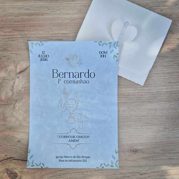 Ideal para anunciar a Primeira Comunhão com delicadeza, sofisticação e bom gosto.
