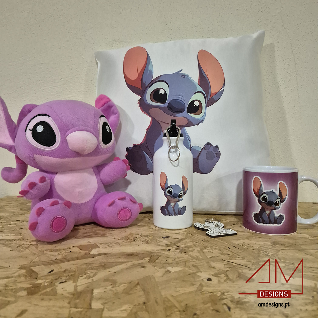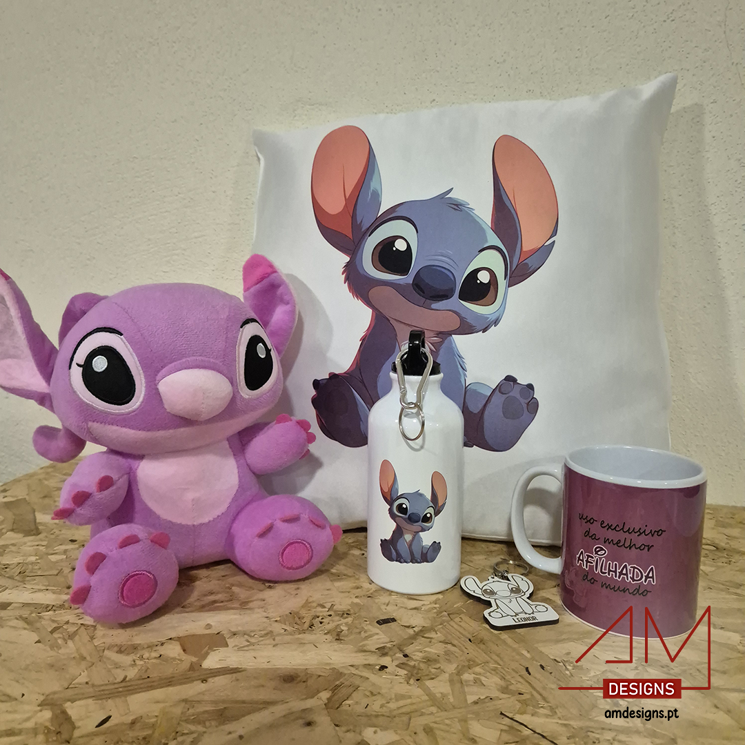 Surpreenda a sua afilhada com um presente irresistível! Este kit exclusivo do Stitch inclui um peluche fofinho, garrafa de alumínio, almofada, caneca e porta-chaves, todos personalizados com o nome da afilhada. Um conjunto encantador, perfeito para os fãs deste adorável personagem, que combina utilidade com um toque de magia.