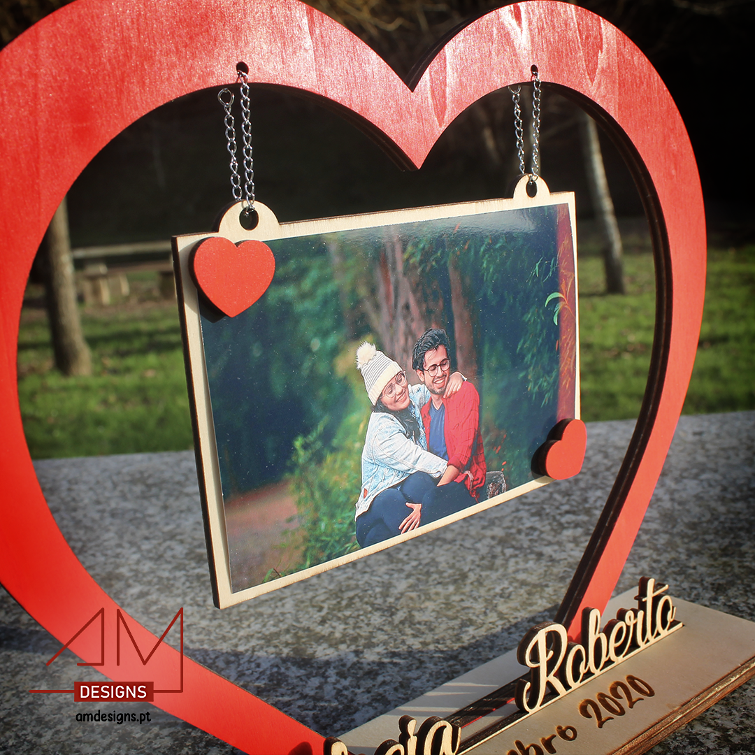Um presente simples de escolher, mas com impacto: porta-fotografia em formato de coração, para uma foto 10x15 (incluída), com base personalizada.