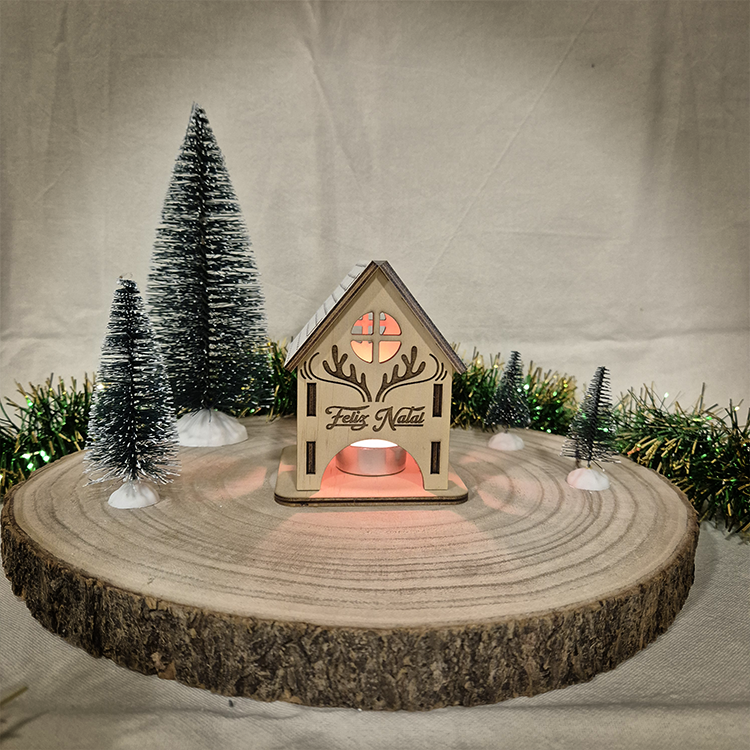 Design natalício encantador: formato de casinha com detalhes recortados e gravação Feliz Natal, ideal para decoração de Natal tradicional ou moderna.