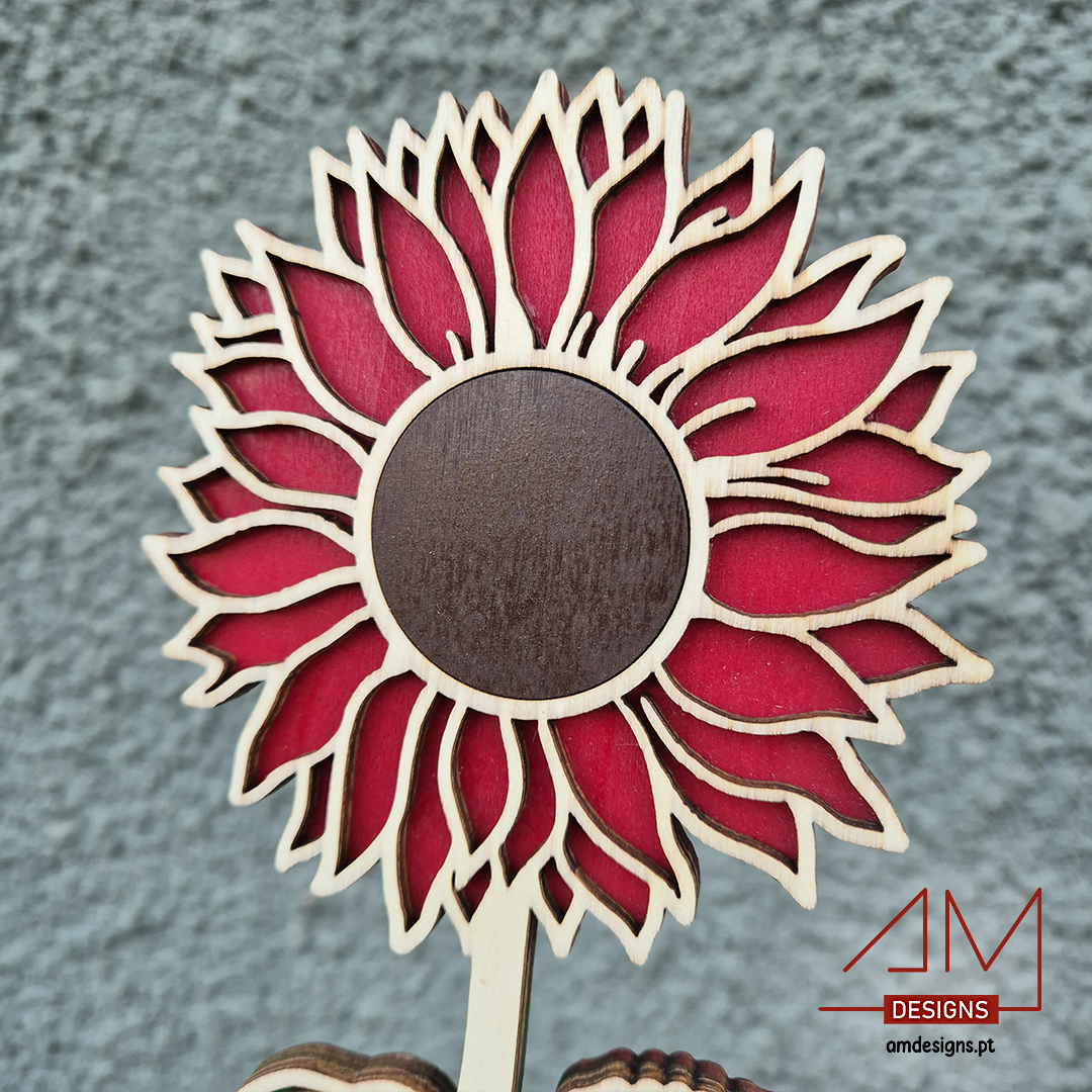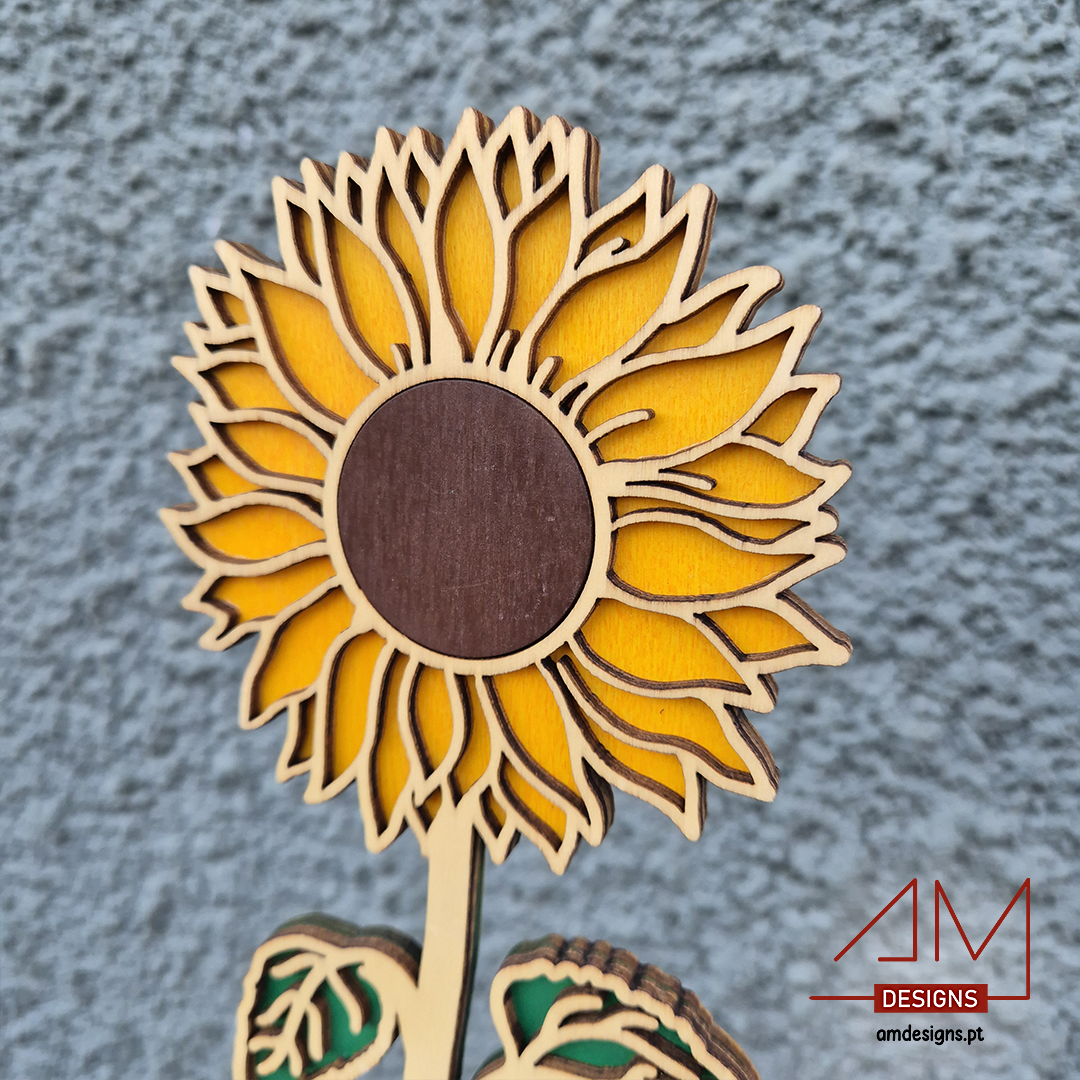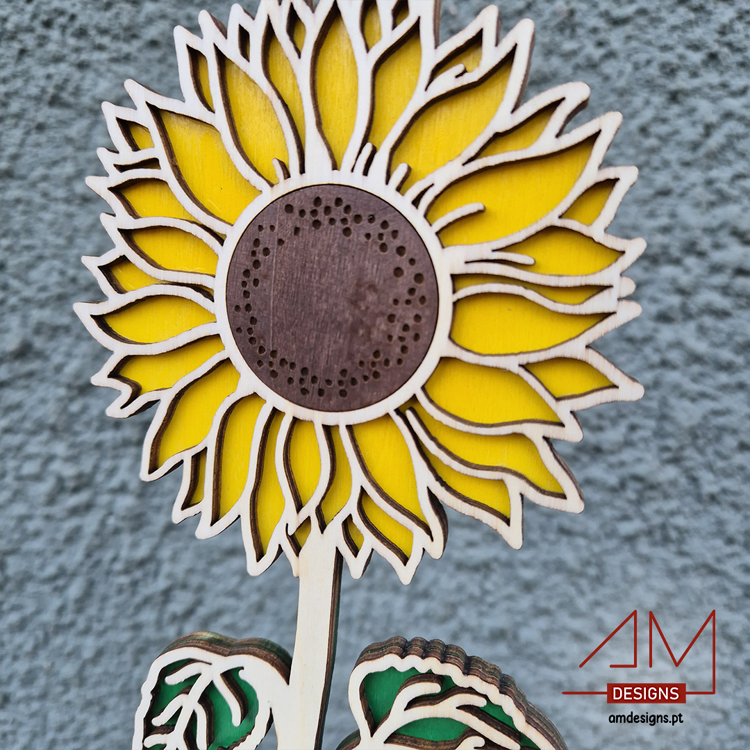 Material de Qualidade: Girassol em madeira resistente, com corte a laser detalhado e um acabamento elegante.