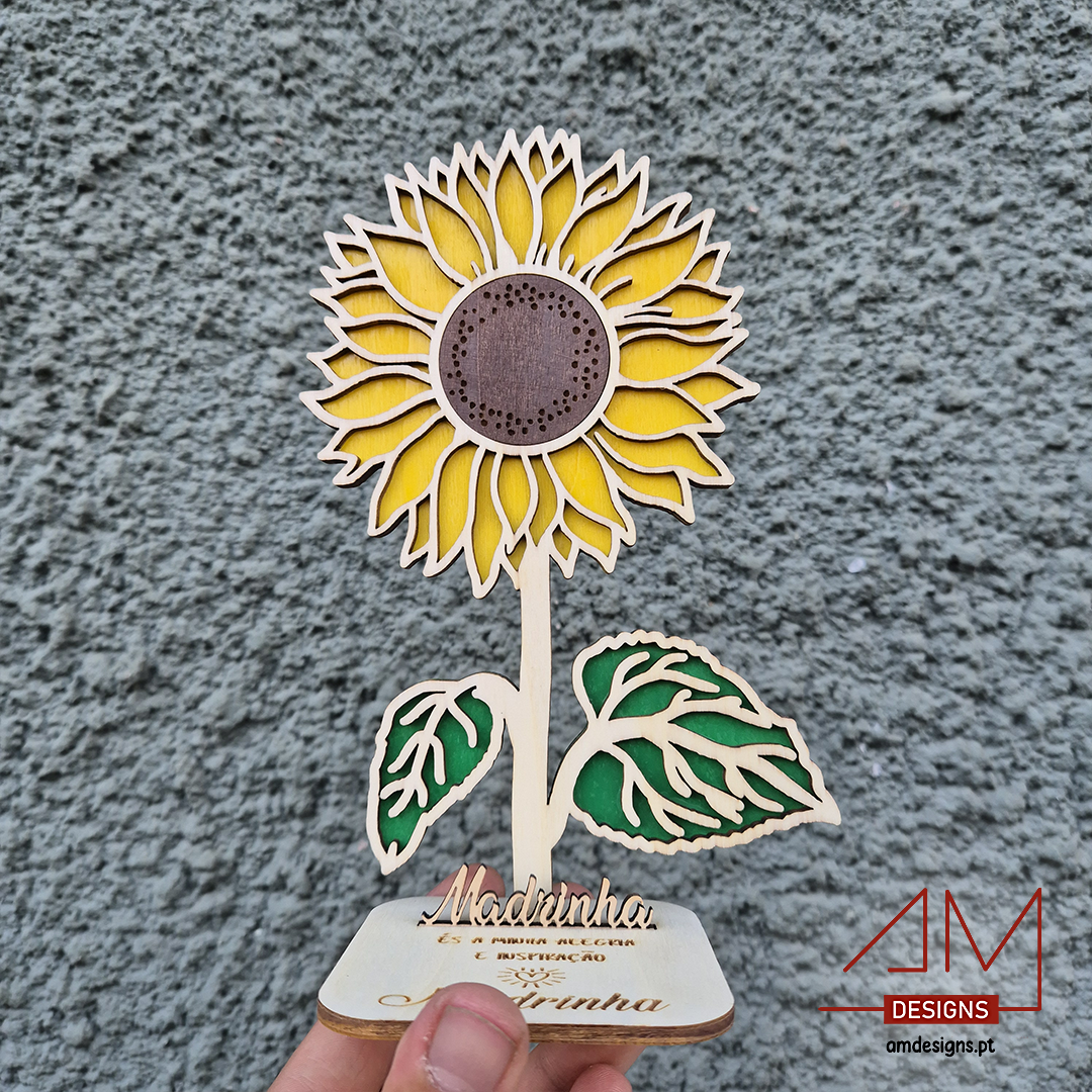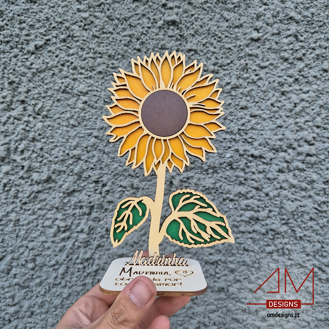 Um presente cheio de significado e beleza para homenagear a sua madrinha. Este girassol em madeira simboliza luz, alegria e gratidão, tornando-se uma recordação eterna do carinho que sente por ela.