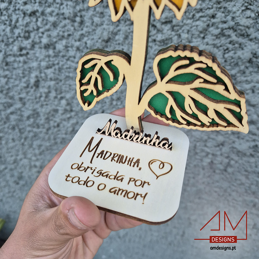 Girassol em Madeira Personalizável para Madrinha – Nome e Mensagem Gravada