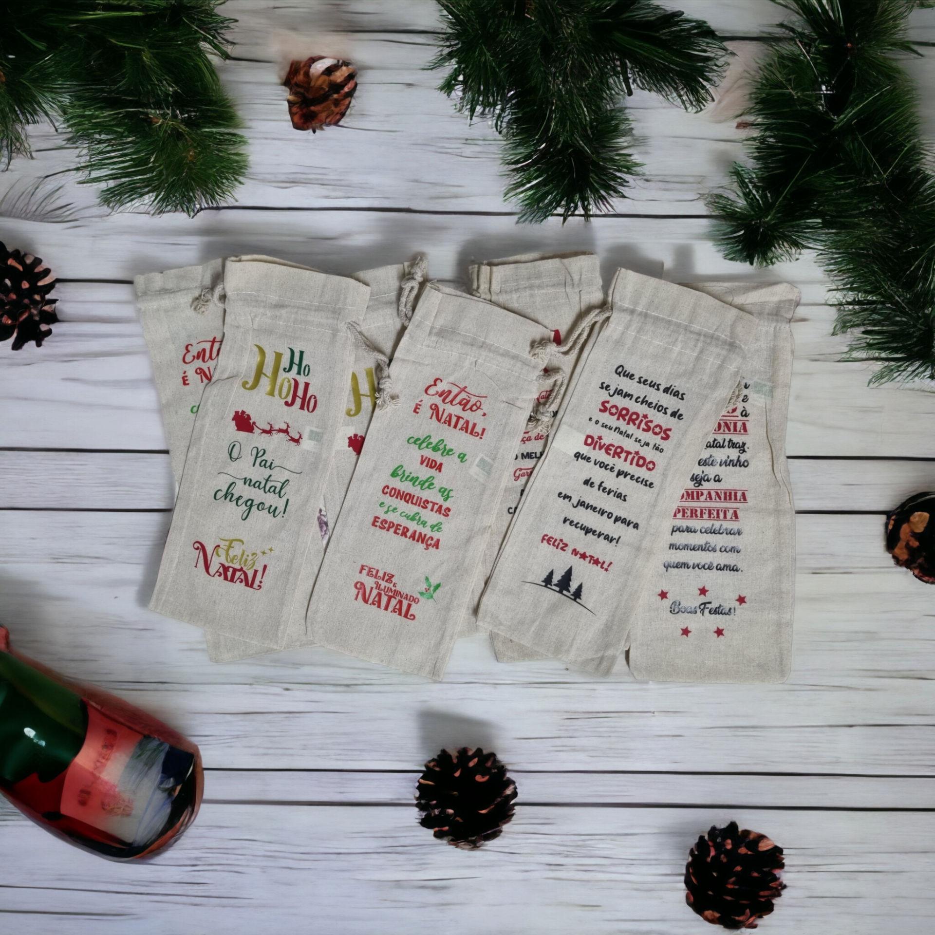 Transforma o teu presente num gesto memorável: Este saco de vinho em algodão com mensagens de Natal é uma maneira elegante e ecológica de mostrar que pensaste em cada detalhe, tornando o momento de oferecer ainda mais especial.